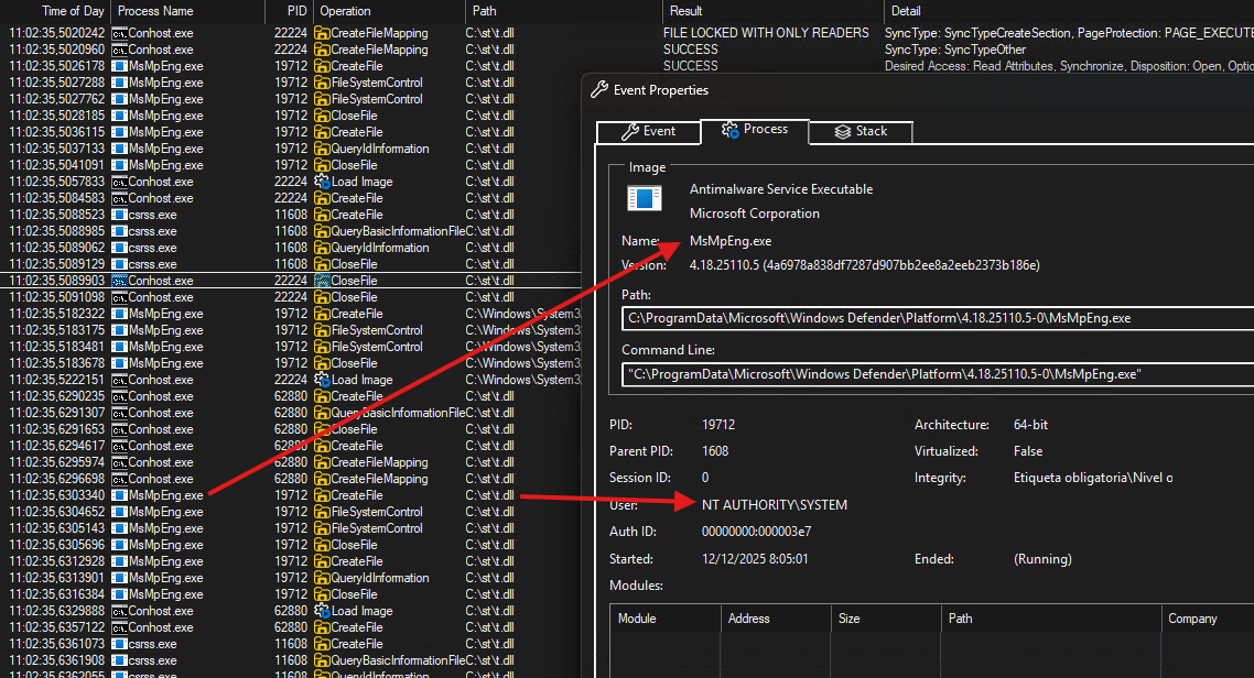 In the following screenshot, we can see that the driver has loaded our malicious DLL into a privileged process (in this case, the Windows Defender process):