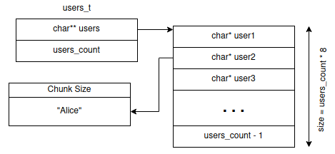 - Edit: change the name of a user, but with a length limit, which will depend on the size of the original username. This size will be obtained from the chunk size header for the username in question.