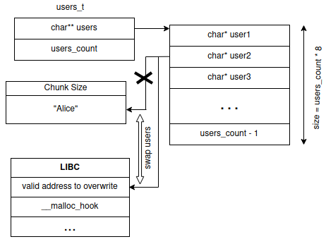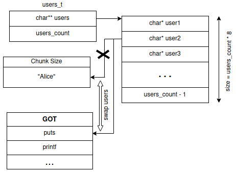 The following diagram shows how to leak the address of one of the GOT functions. First we will overwrite the pointer of one of the users to point to the GOT function, and read it with the list command.