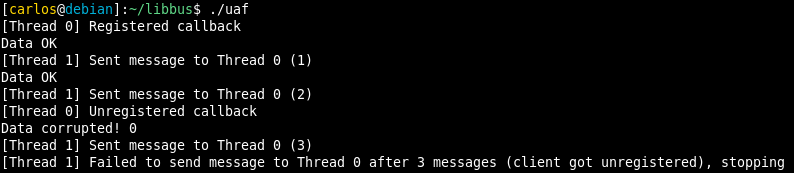 I wrote a quick proof of concept you can find here. The program spawns two threads; the first one registers a callback with a heap-allocated context, waits 2 seconds, unregisters the callback and frees the context. The second one keeps sending messages to the first thread’s callback. The heap-allocated context is an integer containing the value ‘1’. If its value changes due to the memory being freed, the callback will print a message. Running it with the previous version of libbus (commit 7ddda30) should produce something like the following output: