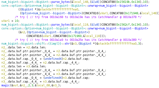 The output is not perfect, but it is much more readable. The input &[u8] struct is formed by the pointer 0x15619b and the length 0x134, while the radix is 10 and the output is placed into local_148. If we keep fixing the function calls eventually we get a semi-readable decompiled output.