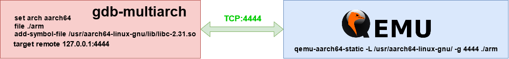 We need to prepare the debbuging enviroment to be able to interact with the binary. On one side we have the qemu-aarch64-static emulator to be able to run it. On the other side we have the gdb-multiarch debugger that connects to the emulator in order to debug the binary.